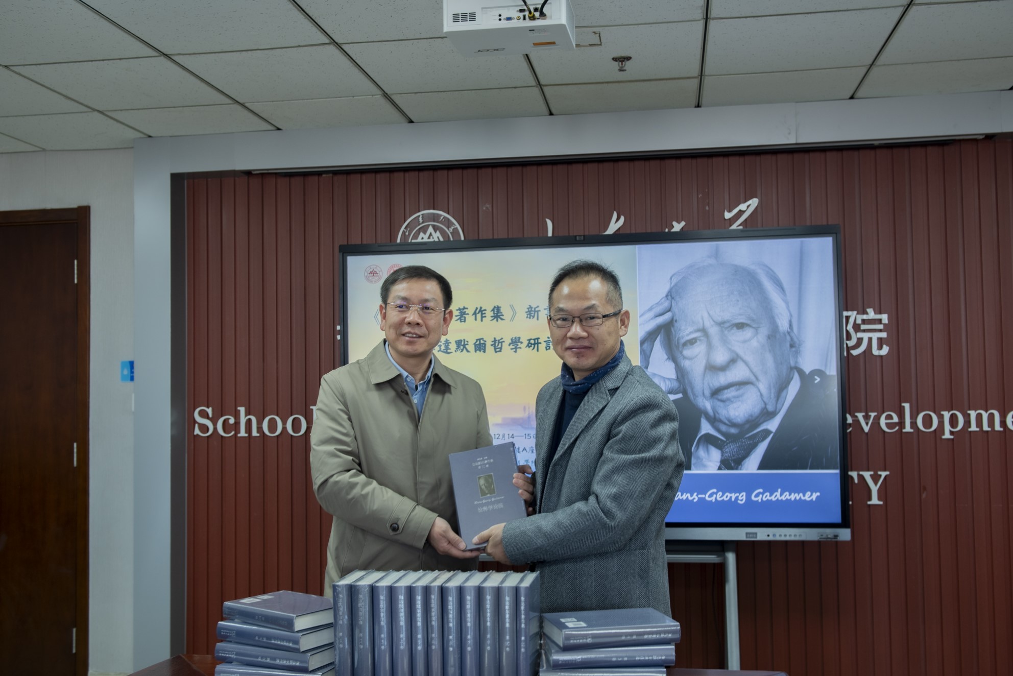 赠书11卷本《伽达默尔著作集》一套;由洪汉鼎教授、刘杰教授、张荣教授、赵卫国教授代表项目团队向出席会议的校外代表专家邓安庆教授、聂敏里教授、张能为教授等各赠一套新书,以表友谊与合作。