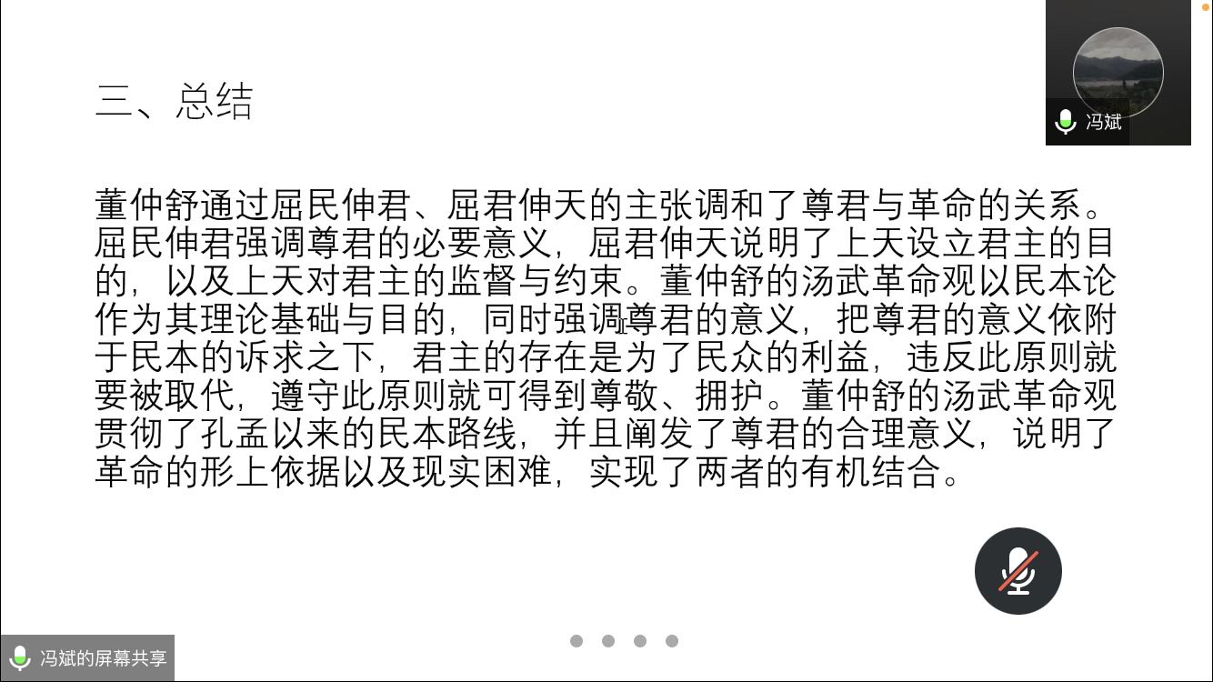 论坛伊始,冯斌对汤武革命的含义及如何看待汤武革命进行介绍,揭示了汤武革命的实质,即以暴力手段推翻无道昏君是否正当,进一步说是尊君与革命之间的张力。随后,他分三部分阐释了董仲舒如何解决这一冲突,一是董仲舒对先秦汤武革命观的继承,二是屈民伸君——尊君的意义,三是屈君伸天——革命的依据。最后,冯斌对主讲内容进行总结,他指出董仲舒通过屈民伸君、屈君伸天的主张调和了尊君与革命的关系,其汤武革命观贯彻了孔孟以来的民本路线,并阐发了尊君的合理意义,说明了革命的形上依据以及现实困难,实现了两者的有机结合。