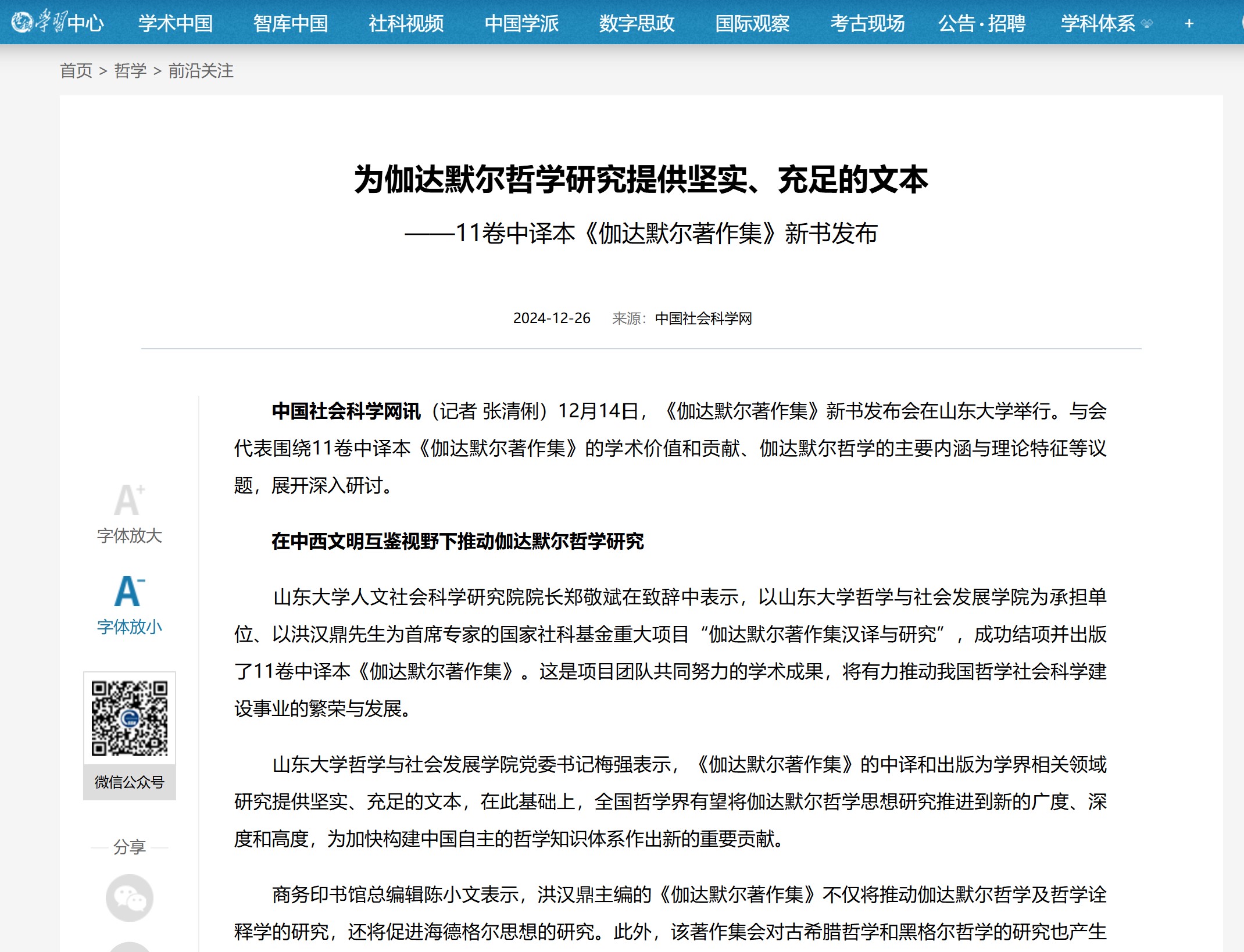 中国社会科学网:为伽达默尔哲学研究提供坚实、充足的文本——11卷中译本《伽达默尔著作集》新书发布