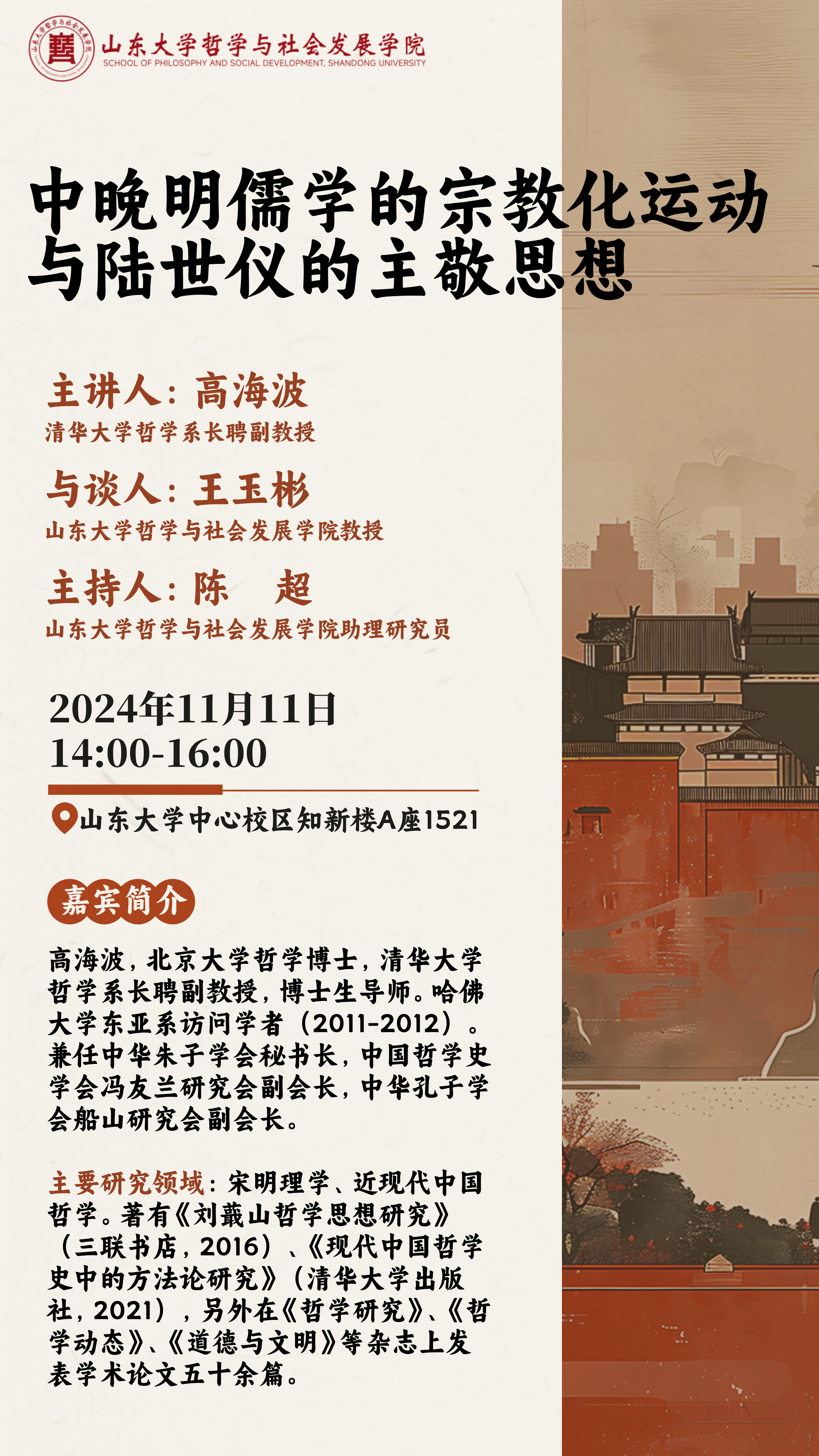 高海波,北京大学哲学博士,清华大学哲学系长聘副教授,博士生导师。哈佛大学东亚系访问学者(2011-2012)。兼任中华朱子学会秘书长,中国哲学史学会冯友兰研究会副会长,中华孔子学会船山研究会副会长。主要研究领域:宋明理学、近现代中国哲学。著有《刘蕺山哲学思想研究》(三联书店,2016)、《现代中国哲学史中的方法论研究》(清华大学出版社,2021),另外在《哲学研究》、《哲学动态》、《道德与文明》等杂志上发表学术论文五十余篇。