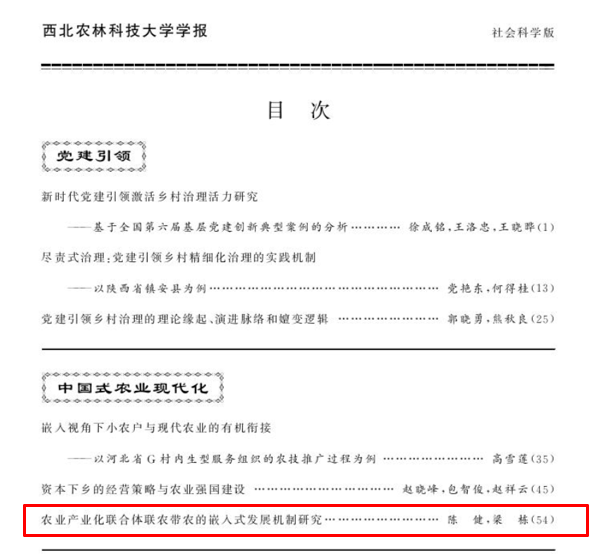 梁栋副教授与江南大学法学院青年教师陈建共同在《西北农林科技大学学报(社会科学版)》2024年第4期上发表了题为《农业产业化联合体联农带农的嵌入式发展机制研究》的高质量论文。