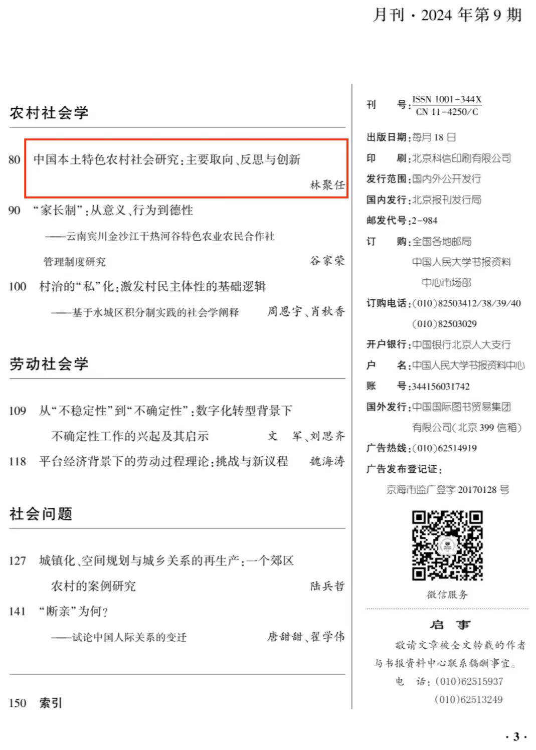 林聚任教授的题为《中国本土特色农村社会研究:主要取向、反思与创新》的高质量论文,该文原载于《西北师大学报(社会科学版)》2024年第4期。