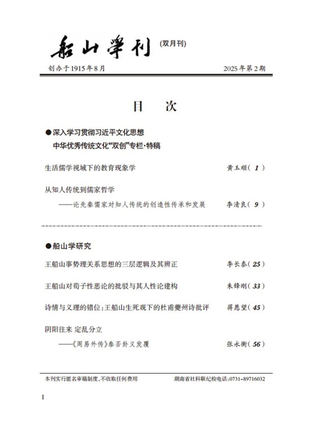 易学与中国古代哲学研究中心博士研究生张永衡在《船山学刊》2025年第2期上发表了题为《阴阳往来 定乱分立——<周易外传>泰否卦义发覆》的高质量论文。