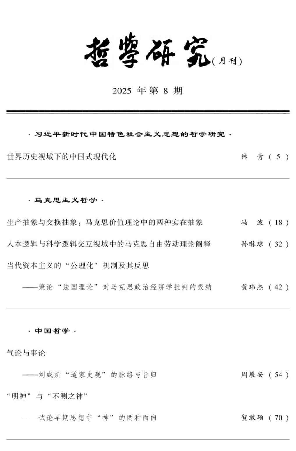 冯波教授在《哲学研究》2025年第8期上发表了题为《生产抽象与交换抽象:马克思价值理论中的两种实在抽象》的高质量论文,系该期封面重点论文之一。