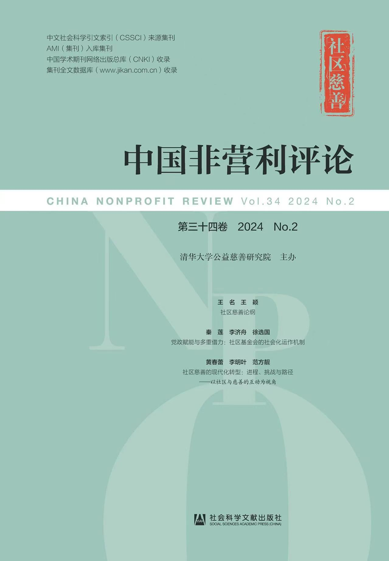 《中国非营利评论》由清华大学公益慈善研究院主办,创刊于2007年12月,是国内第一本以非营利组织、公益慈善与志愿行为主题的专门性学术刊物,汇聚了国内非营利研究的前沿学术成果。自创刊以来,已出版34卷500多篇文章,期刊连续入选中文社会科学引文索引(CSSCI)、中国人文社会科学期刊综合评价指标体系(AMI)、社会科学文献出版社CNI名录集刊等多个目录。期刊2015年获社会科学文献出版社各学科领域集刊综合排名第一名,2018-2025年连续8年荣获社会科学文献出版社年度优秀集刊奖。