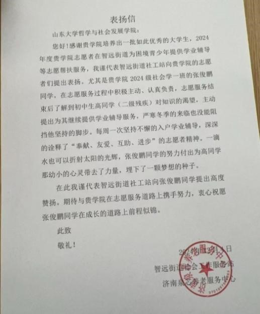 收到一封来自智远街道社会工作服务站的表扬信,信中对学院 2024 级社会学一班张俊鹏在志愿服务中的突出表现给予高度赞扬,同时对学院在人才培养方面的成果表示肯定。