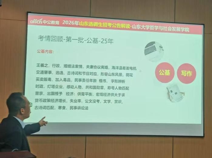 讲座伊始,主讲老师首先对山东省选调生项目的整体情况进行了宏观解读,系统梳理了近年来山东省在选调生招录方面的政策导向与显著特点。通过对省直机关、地市部门及基层岗位的对比分析,讲师结合详实的数据与典型案例,重点介绍了济南、青岛等省内重点城市,以及部分潜力地区在选调生招录规模、专业需求、培养模式、发展平台及待遇保障等方面的具体政策与差异。通过对不同城市比较优势的清晰呈现,帮助同学们根据自身专业背景、职业规划与地域偏好,做出更为精准和理性的选择,为同学们的报考决策提供了极具价值的参考。