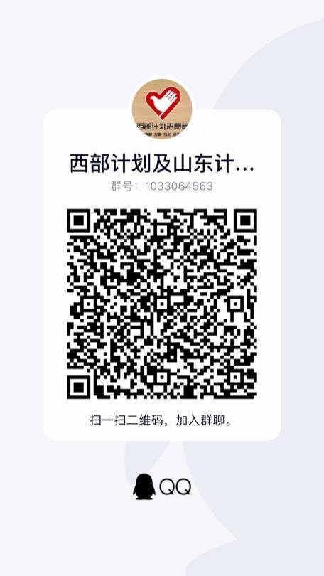 西部计划及山东计划面试、体检等工作后续另行组织,参选学生请务必加入西部计划及山东计划招募工作沟通交流QQ群:1033064563(二维码如下)并及时关注“青春山大”官网及公众号“青春山大”“山大研究生支教团”后续通知。