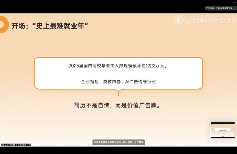 研究生会在“勇往‘职’前”第三届简历设计大赛的基础上组织简历设计指导经验分享会,邀请学校优秀校友、济南城建集团有限公司人力资源管理部曹玉涛、廉雪进行指导与分享。辅导员吕汶鑫老师主持活动,学院百余名同学参与。