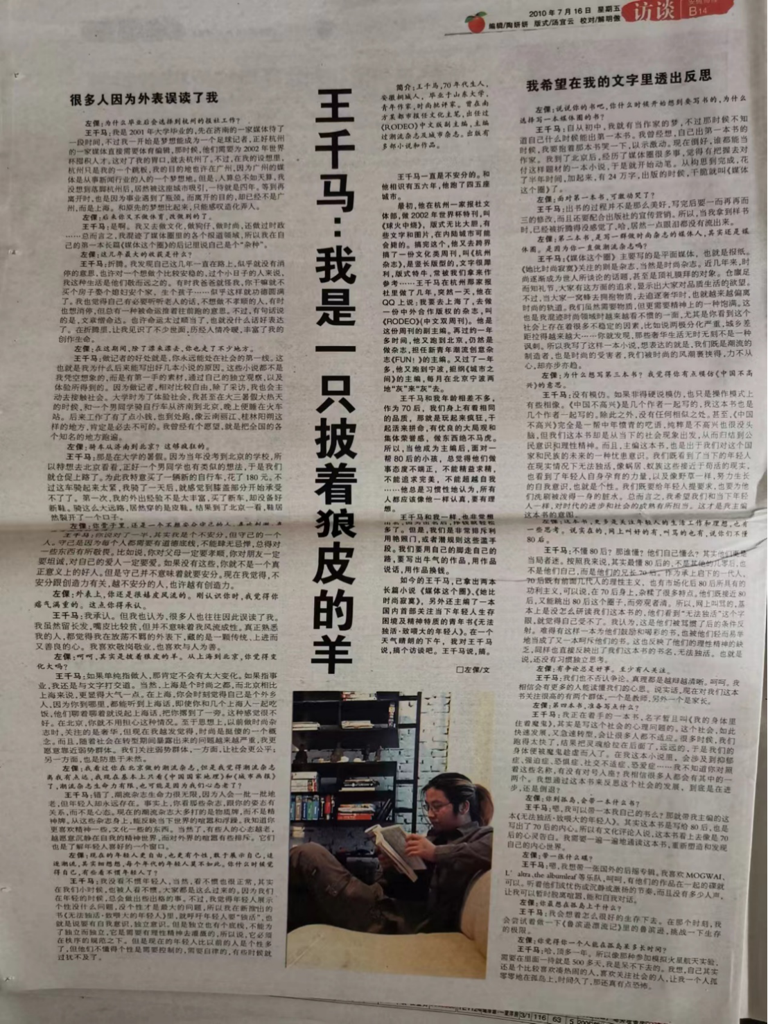 毕业后,王千马经历了从纸媒工作到新媒体工作的转型,并选择了区域经济和人文历史的话题进行深耕和发掘。谈及新旧媒体的转化,他指出了颇多有深度的见解。一方面,他认为,从纸媒进入新媒体,是一个不可逆转的趋势,尽管有些不舍,但只能顺之者昌逆之者亡。他说,自己还是喜欢报纸的样子,每想起版式、标题、采写、广告、发行等与报纸有关的元素,还是心有戚戚,“这是每一个被旧时代渲染的人,都有的无可奈何花落去的凄凉,当然,人类之所以在不断进步,正在于他们喜欢回望的同时,依旧坚定地前行”。另一方面,他也深切地看到人人都有麦克风的时代中,内容品质良莠不齐、泥沙俱下的现状。王千马认为,自媒体的兴起,让很多文化程度不高的使用者大行其道,这带来的只能是网络上的各种奇形怪状。某种意义上,自媒体作为新时代的传播媒介,微信、微博等平台给其带来了病毒式传播的特性,只要点燃了民众的情绪,就能够在极短的时间内得以广泛的传播。这既倒逼传统的传播路径予以改变,但也容易导致精英意识消亡,为了生存,他们只能不断地“下沉”,并被同化,最终劣币驱逐良币。