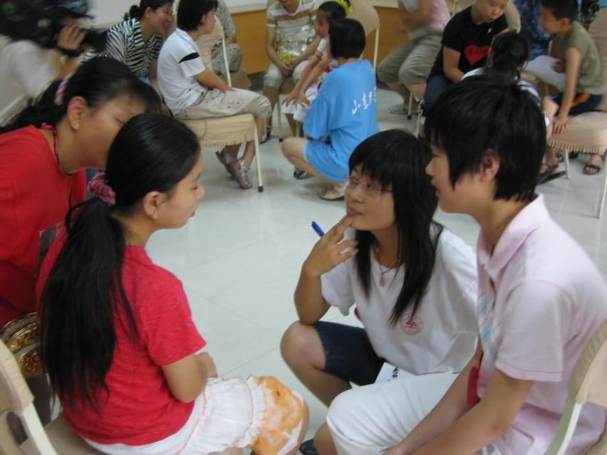 图2 2008年7月,张海丽在“快乐一夏”阳光家庭青少年服务项目中同孩子们及家长共商服务
