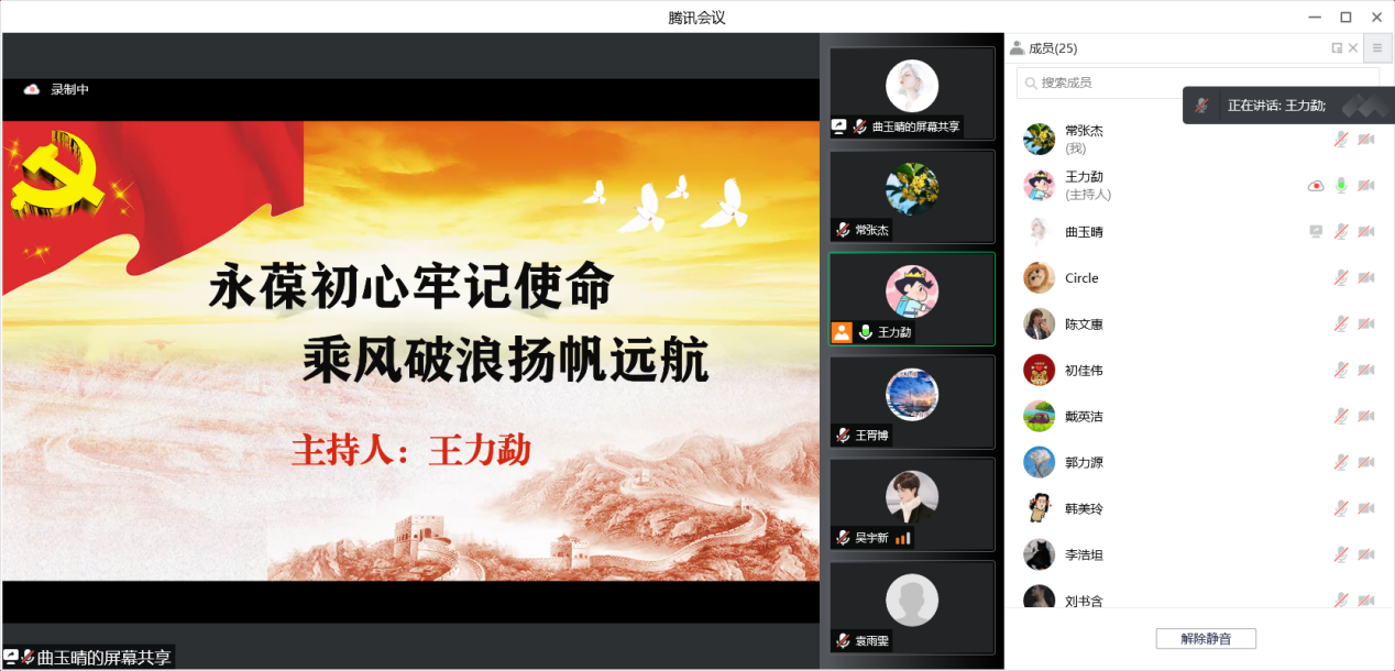 本科生党支部响应党委学生工作部号召,以线上形式举办“永葆初心牢记使命,乘风破浪扬帆远航”主题党日活动,由本科生党支部书记王力勐主持。通过重温入党誓词、交流党史学习心得的方式,全体党支部成员深入学习贯彻习近平新时代中国特色社会主义思想,学习贯彻党的十九届六中全会精神。