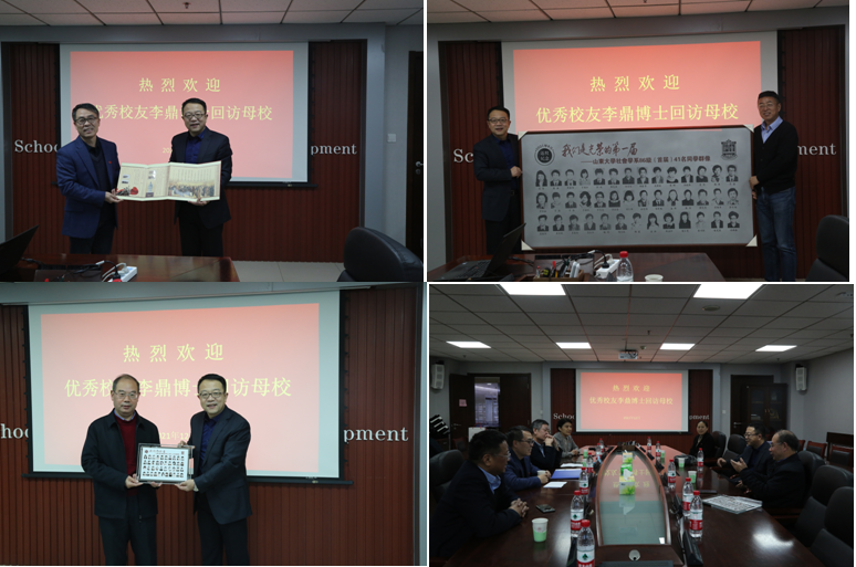 120周年校庆纪念邮册等纪念品。学生代表向李鼎博士献花,表达了对校友的感激和敬意。李鼎博士与诸位老师一起参观学院、校友墙,畅谈学院变迁,共忆往日岁月,共叙师生情谊,共话母校发展。