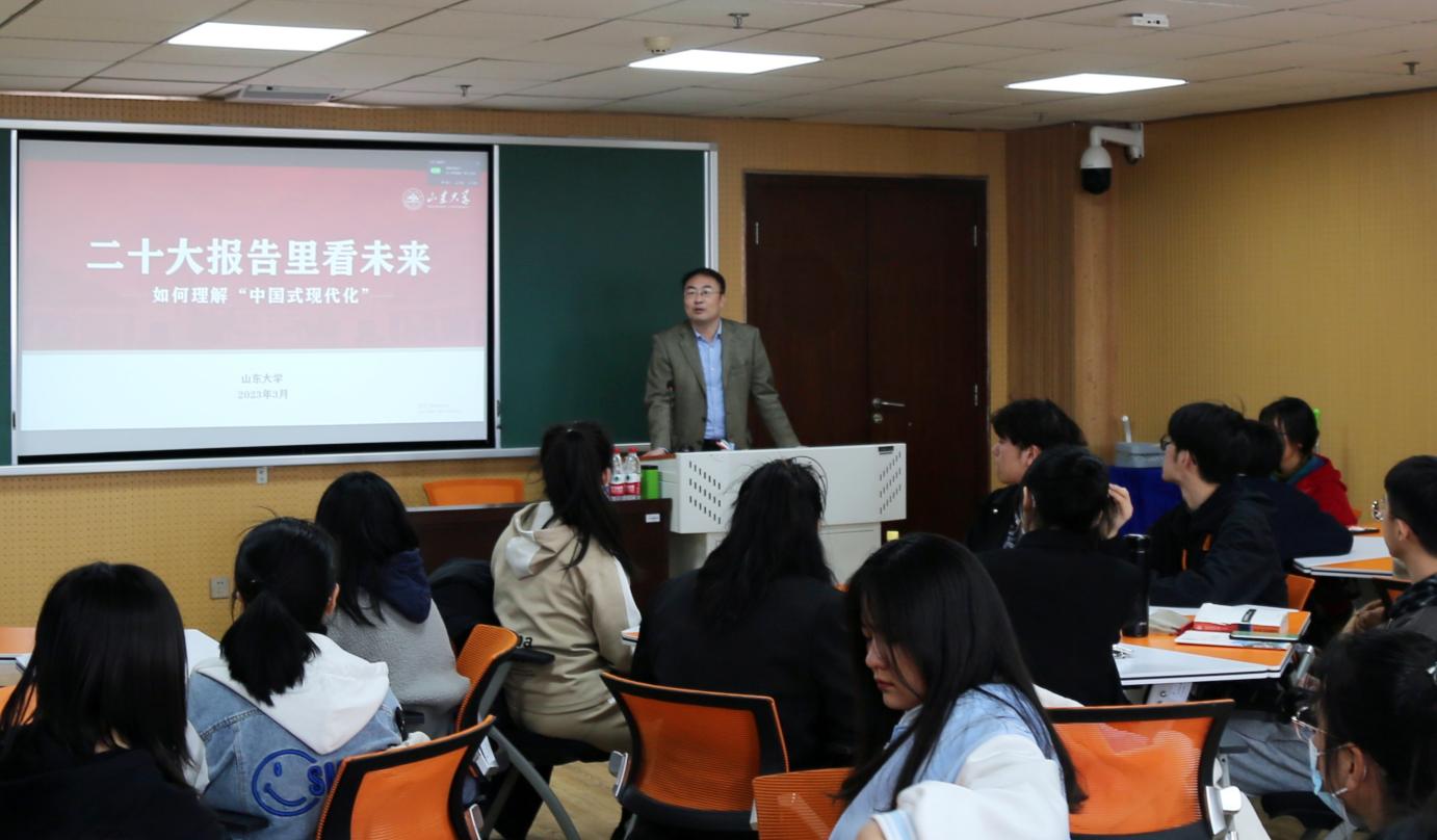 曲明军向同学们做了题为“二十大报告里看未来——如何理解‘中国式现代化’”的报告。他从同学们的学习生活实际和当下所面临的选择出发,娓娓道来,深入浅出,详实阐释了“什么是中国式现代化” “推进中国式现代化所面临的战略机遇和风险挑战”,并围绕“党的二十大报告实现了中国式现代化理论和实践的新飞跃”和 “全面建设社会主义现代化国家的战略安排”两个方面,对党的二十大精神进行了解读。互动环节,同学们分享了学习党的二十大精神的体会与收获,纷纷表示近年来中国发展取得的成就举世瞩目,作为青年学子,要积极响应国家号召,坚定不移听党话、跟党走,练就过硬本领,砥砺奋斗前行,用实际行动为中华民族的伟大复兴贡献青春力量。曲明军对同学们的感悟进行了回应和肯定,并对大学生贯彻落实党的二十大精神提出要求:一是要将党的二十大精神落实到日常学习中,将个人志向、奋斗行动与祖国需要、人民期盼高度契合;二是要坚持理论学习,提升思想认识,担当时代责任,发挥青年积极性与创造性;三是作为社会学专业的学生,在夯实专业基础的同时,还要厚植家国情怀,用实际行动为社会主义现代化建设贡献力量!