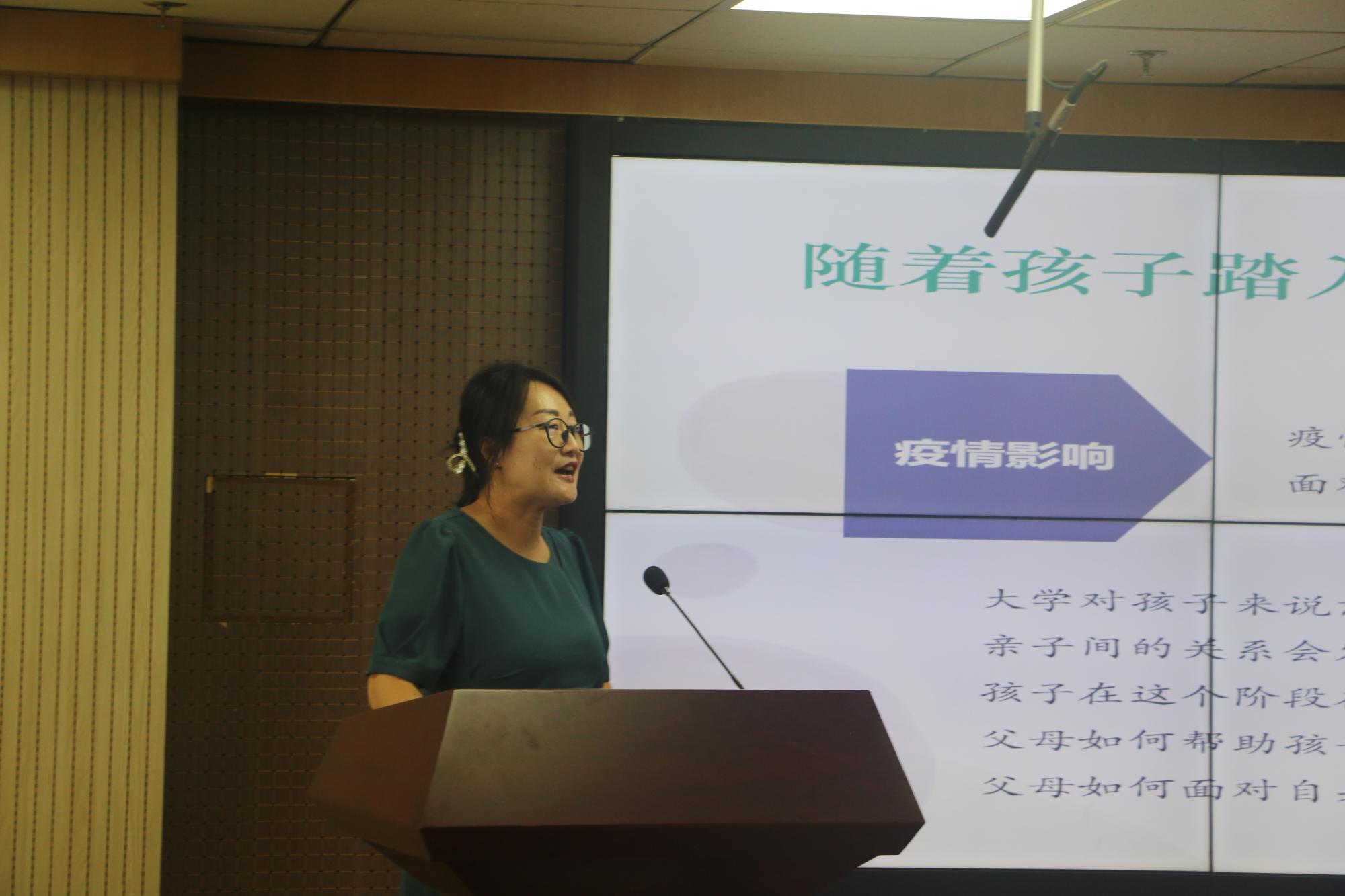 心理健康教育与咨询中心副主任刘倩倩在会上针对新生家长心理健康教育做了精彩讲座。在讲座中,刘倩倩指出新生在面对疫情影响以及大学适应期等方面情况下可能出现的一系列问题,引导家长在孩子离开家庭后正确认识和塑造健康的心理状态,同时还并强调了亲子沟通和家校合作的重要性。