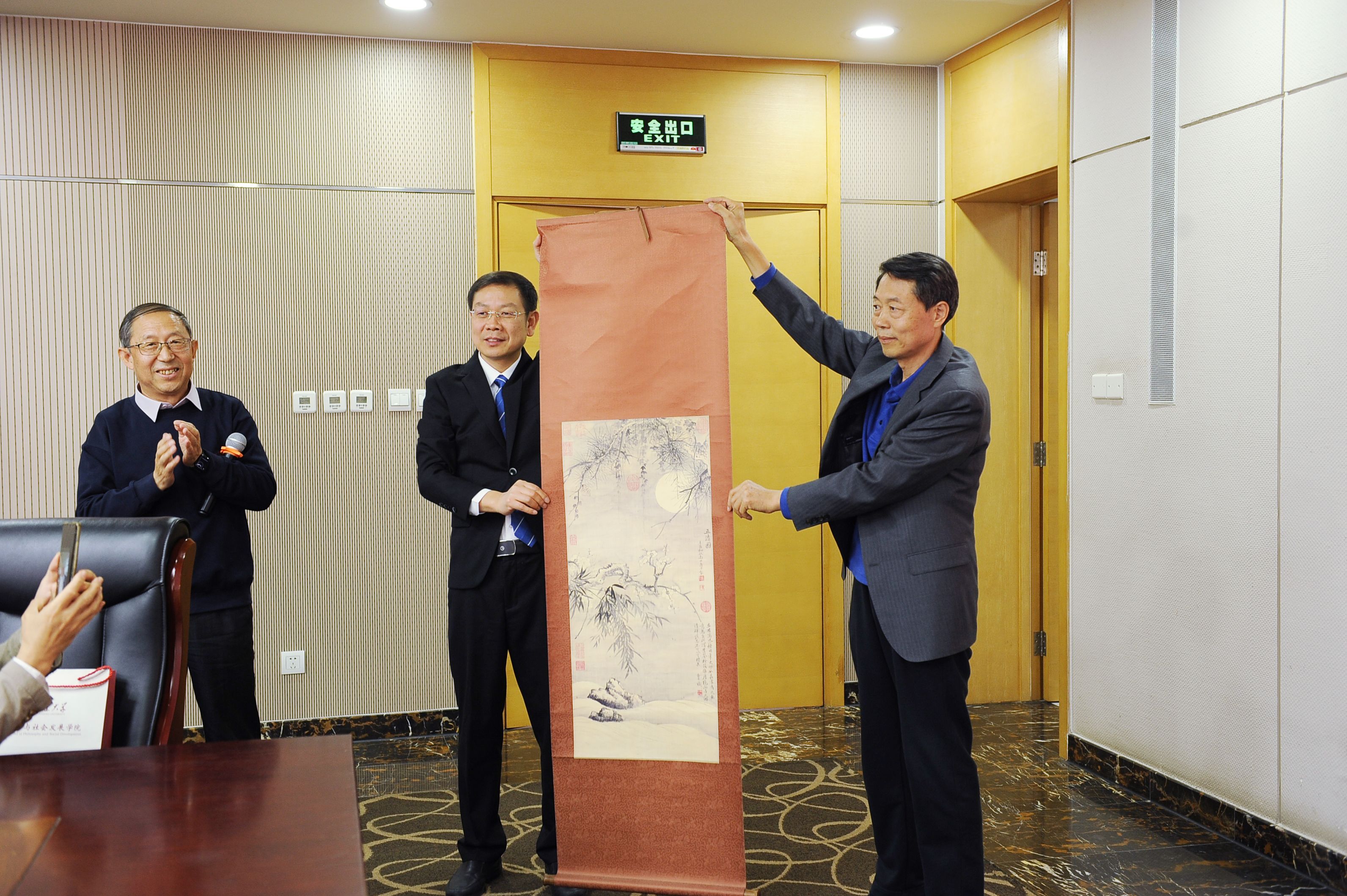 牛建科、俞晓光、林忠军代表哲学1980级校友向学院赠送了纪念礼品。