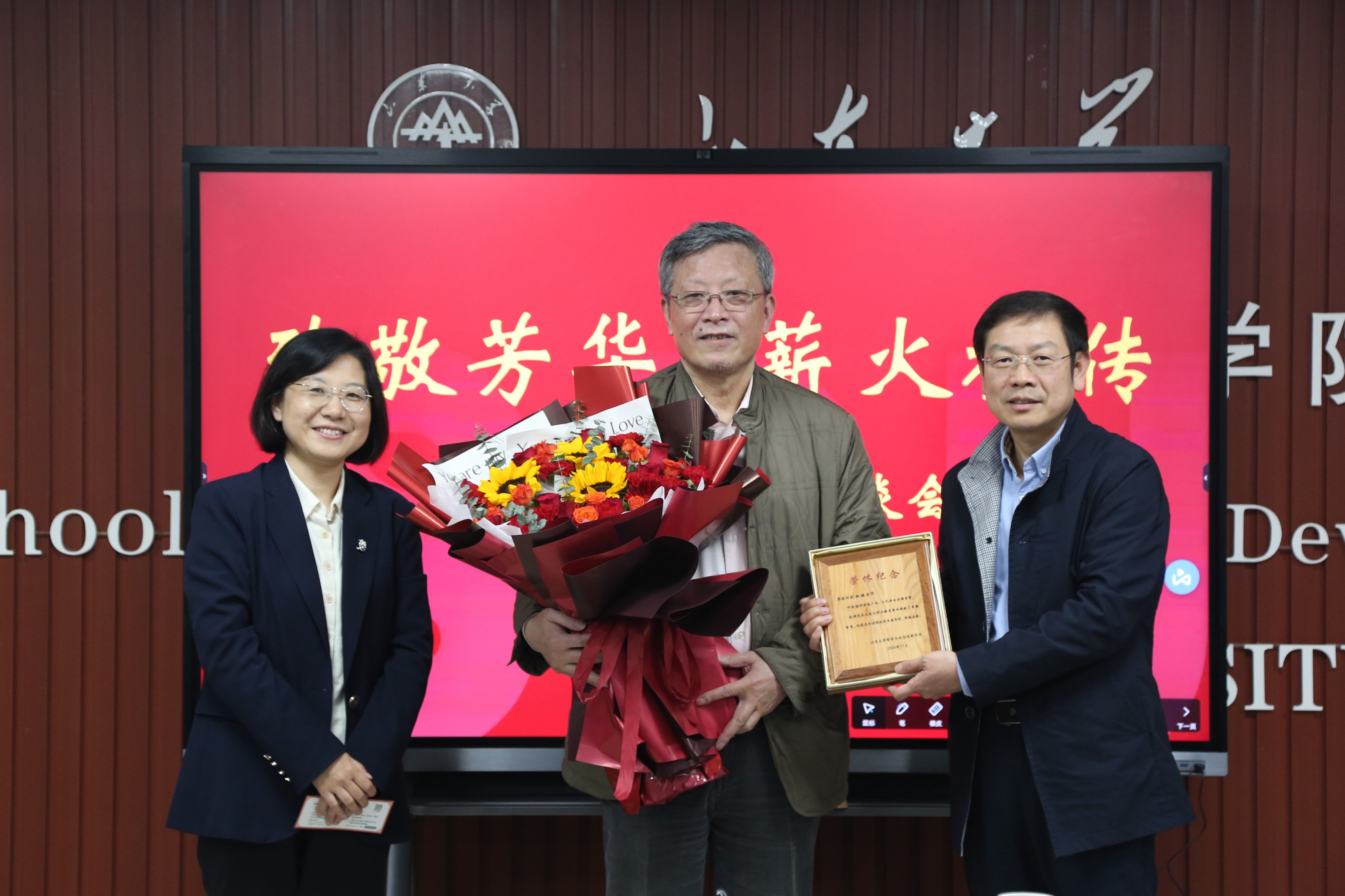 座谈会上,与会老师共同追忆、畅谈与刘陆鹏老师的同窗和同事情谊。大家兴致盎然,回忆往昔岁月相处的难忘时刻与轶事,不时传来欢快的笑声和掌声。在热烈氛围中倾诉不舍之情,寄予真切祝福。刘陆鹏老师回忆了工作中的难忘经历,表达了对学院关怀的衷心感谢和对学院事业发展的美好祝愿,以及对青年教师的谆谆嘱托,激励大家努力拼搏,勇创佳绩。青年教师表示要学习传承好老教师爱岗敬业、乐教爱生、知行合一、甘于奉献的优秀品格,当好学生成长成才的引路人,争做新时代“四有”好老师。整个交流会场散发出教育的情怀、哲学的智慧和人性的光辉。