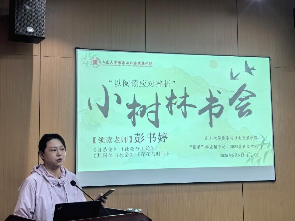 “繁星”学业辅导站于知新楼A116组织开展了小树林书会活动。此次活动由2024级社会学一班承办,人类学系彭书婷老师以“以阅读应对挫折”为题进行分享,学院社会学专业本科生参加了学习。党委副书记翁祥栋、辅导员封莹共同参与。