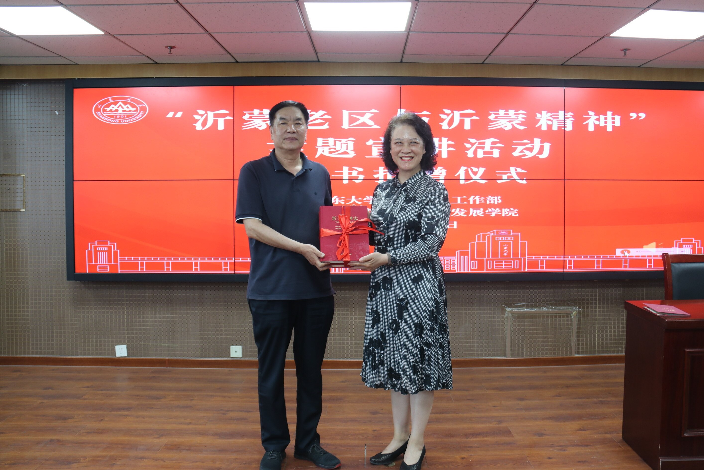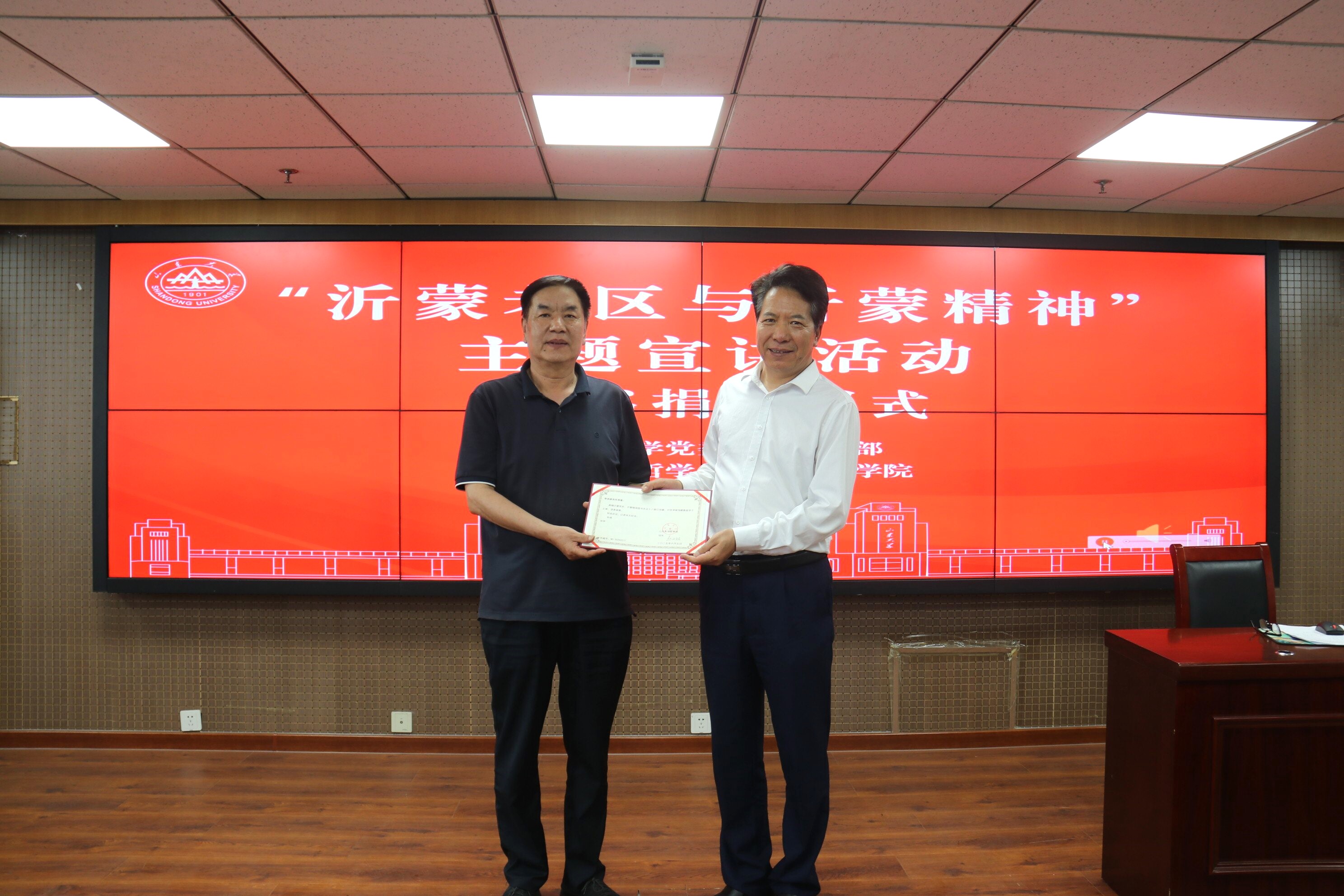 图书馆捐赠了沂蒙党史、沂蒙精神图书共五十八册。在图书捐赠仪式上,曹现强向李洪彦颁发捐赠证书,汲言斌代表学校接受捐赠图书并表达诚挚感谢。