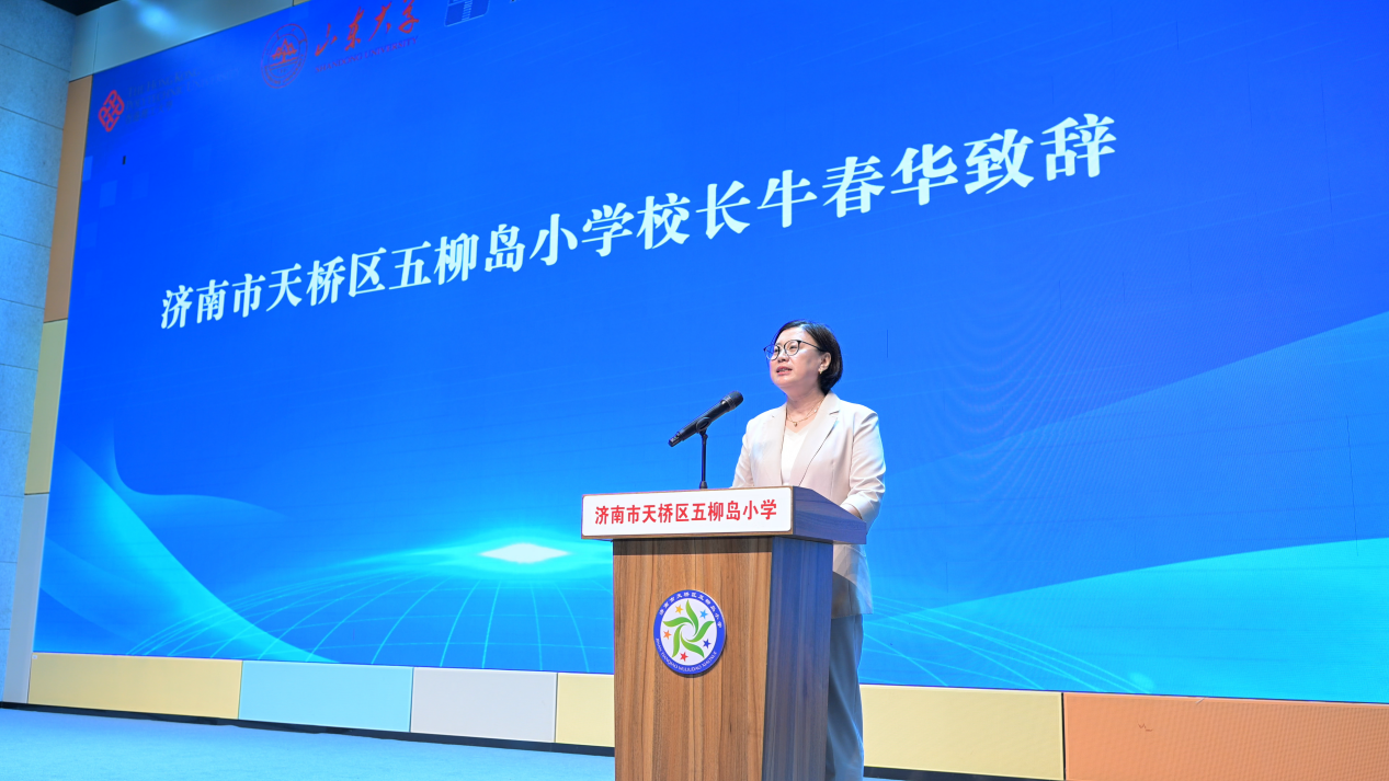 牛春华介绍了五柳岛小学的办学特色与文化底蕴。她表示,学校将全力做好服务保障工作,为同学们营造温馨舒适的学习环境,在五柳岛小学度过一段难忘的时光。