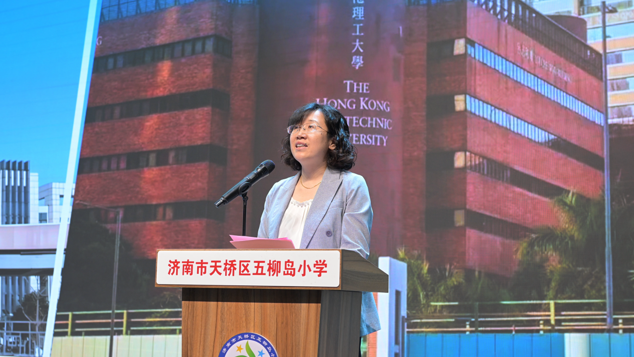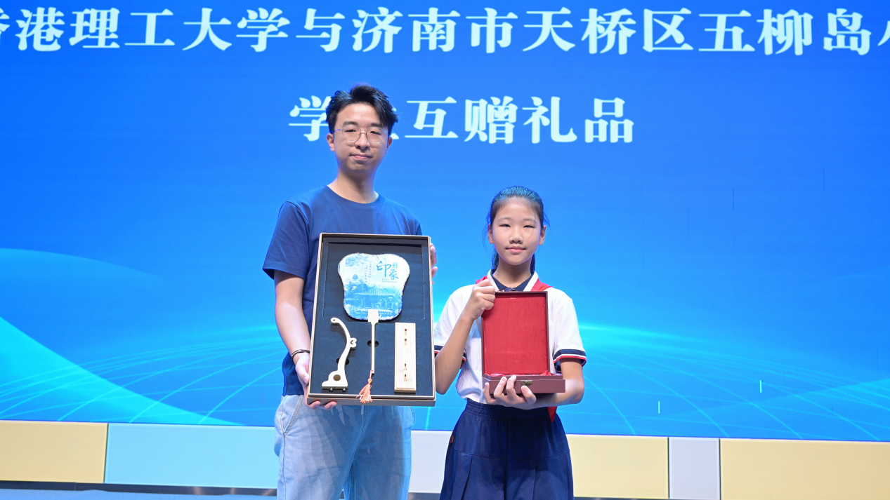 典礼上,最温馨的环节当属香港理工大学与五柳岛小学学生代表互赠纪念礼物。香港理工大学学生代表送上了象征学校及真诚问候的校徽,五柳岛小学学生代表则送上了学校蓝晒社团的精心之作——作品上清晰地印着“四面荷花三面柳”的优美诗句,这不仅是济南大明湖的真实写照,更是济南这座城市独特韵味的生动体现,传递着济南的文化底蕴。小小礼物承载着深厚的情谊,架起了两地学子心灵沟通的桥梁。