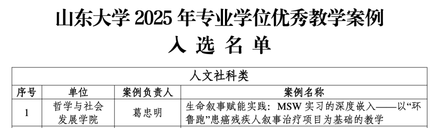 2025年专业学位优秀教学案例评选结果,全校共20项教学案例获奖。我院葛忠明教授团队申报的《生命叙事赋能实践:MSW实习的深度嵌入——以“环鲁跑”患癌残疾人叙事治疗项目为基础的教学》案例,荣获开车漫画