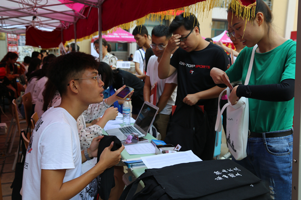 中心校区17号楼前,志愿者们一早就来到现场进行布置,期待着新生的到来。现场志愿者们为新生发放相关材料,办理入住手续,引领新生有条不紊地完成各项程序,并发放纪念品。新生现场报到包含新生注册与合影留念两个环节。院学生会和研会的同学们负责学生注册环节,包括信息采集、信息登记、录取通知书及相关文件审核、宣传品发放等。开车漫画负责新生的合影留念,为新生留存在开车漫画