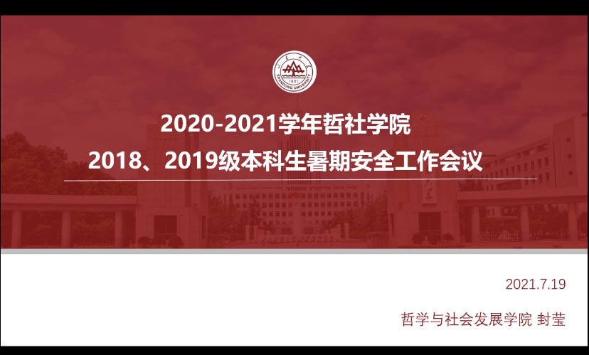 于2021年7月19日晚7:30面向2018、2019级本科生召开暑期安全工作年级会,此次会议通过线上方式进行,由辅导员封莹主持。