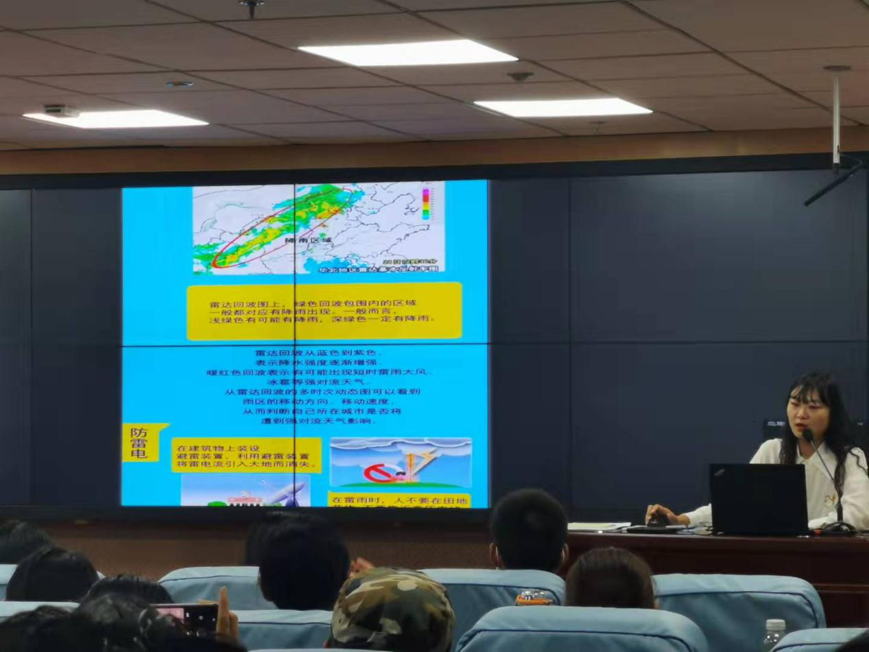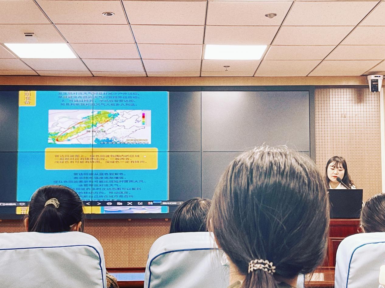 讲座中,班梦姣指出,应对恶劣天气,首先要做好前期预防。积极关注所在地气象台的短时临近预报预警,尽量避免在恶劣天气时进行户外活动。随后她为同学们介绍了雷达回波图的读图方法以及应对雷雨、大风、冰雹等恶劣天气时的注意事项。她结合今年暑期河南特大暴雨灾情,提醒同学们注意防范突变天气和极端天气,并鼓励大家学习气象灾害预防的其他相关知识,以在特殊情况下最大程度保障自身安全。
