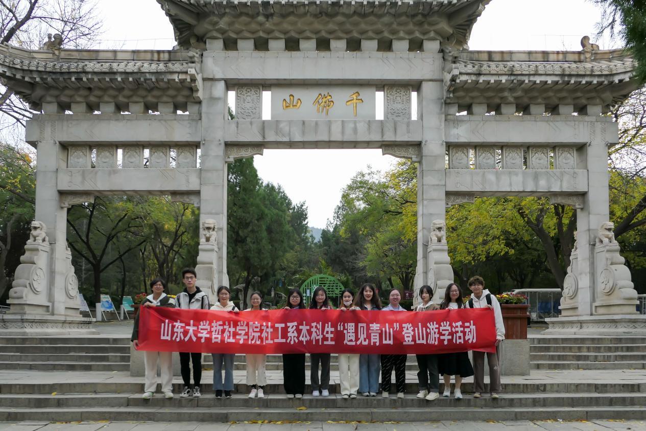 社工系19级、20级、21级本科生进行线下见面交流会,并共同举办“遇见青山”登山游学活动,攀登济南名胜千佛山,在游学过程中交流心得体验。