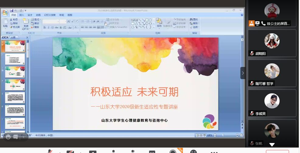 在腾讯会议平台举办以“积极适应,未来可期”为主题的2020级新生心理适应性教育讲座,新生辅导员史艺姝主讲,全体本科新生参加。