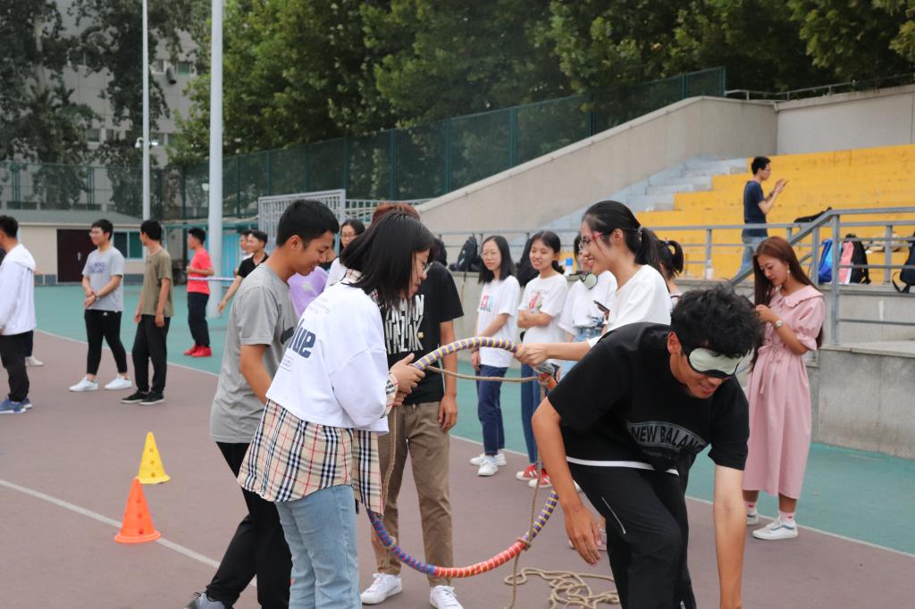 院学生会组织展开,新生们按班级分成三个小组,每个小组由一名院学生会干事带领参与游戏。首先干事们组织各个小组围成一个圆圈在音乐的指引下集体跳兔子舞。在刚开始跳时,同学们出现了踢到其他同学的情况,这种情况在同学们善意的谅解和欢乐的笑声中逐渐减少,慢慢的大家都跟上了音乐的旋律并熟悉了舞蹈的动作,有节奏地跳完了兔子舞。接着进行的是蒙眼游戏,游戏采取两两合作形式,由一个同学引导另一个被蒙住眼的同学慢慢穿过呼啦圈,再引导他越过呼啦圈旁的绳子。蒙眼游戏不仅加强了同学们的团队协作精神,提高合作能力,还促进了同学之间的友谊。最后同学们还做了击鼓传花、千千结等一系列的小游戏,一些小组还自发地玩起了同学们当场想到的小游戏,活动场面十分热闹,同学们充满了激情与活力。一个小时过后,本次新生素拓活动在欢乐与笑声中圆满结束了。