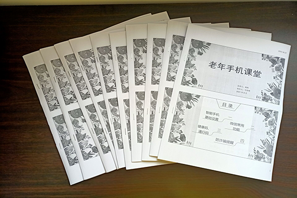 两位成员走进社区,为每位老人分发了“老年手机课堂”的课件打印资料。之后成员通过图文并茂、实操指导的方式为成员们进行了功能的逐个讲解,来帮助老人更好地学习手机的若干常用功能。