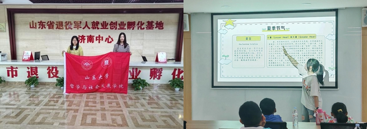 “戎创齐鲁”调研团前往山东省退役军人就业创业孵化基地——济南中心开展实地调研,与基地管委会负责人陈霞、基地运营团队工作人员王鑫等4人、军创企业负责人崔兆虎进行访谈。在为退役军人就业贡献力量的同时,也引领青年学生厚植家国情怀,勇担时代使命。同时为响应“优秀文化进社区”号召、推动中华优秀传统文化传承,“童声绘古今——文脉使者培养企划”实践团队于山东省济南市智远街道兴港悦城社区开展了一场融合英语教学与中华优秀传统文化的课外活动,既提升了社区学生的英语应用能力,又深化了其对传统文化的认同,展现了“高校-社区”联动传播文化的积极价值,推动助力培养能用中国声音讲好中国故事的人才。