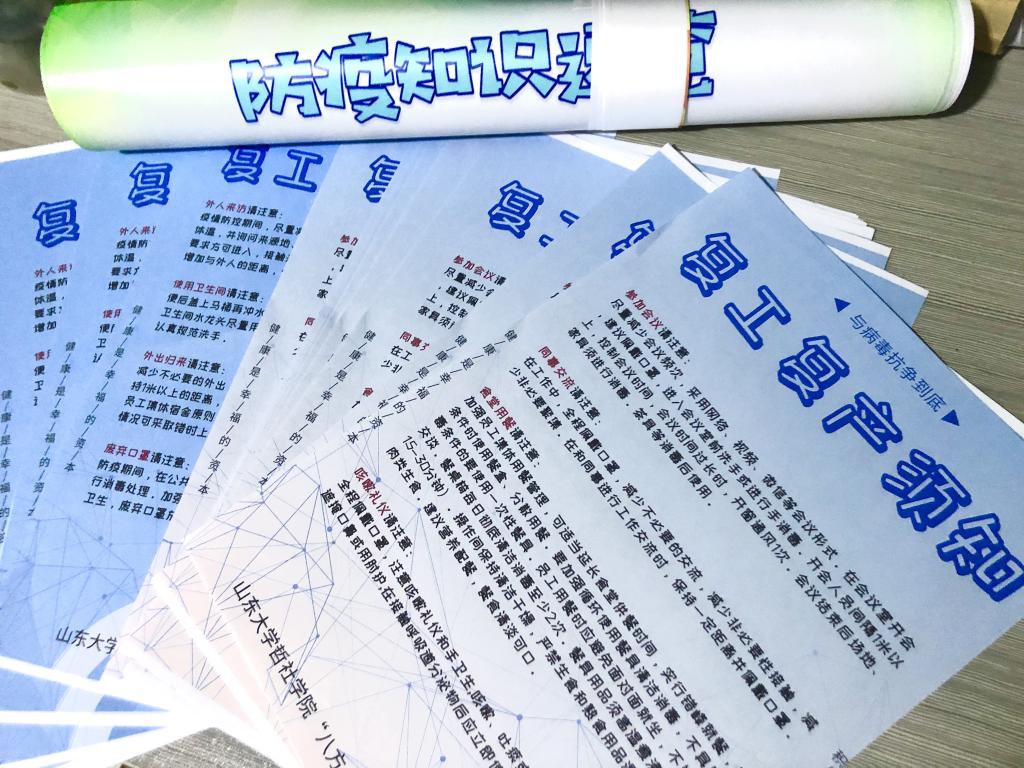 与此同时,线上工作小组利用前期工作中收集的防疫知识,精心设计了多份宣传海报。宣传海报的设计工作从实用性出发,内容涵盖参加会议须知、食堂用餐须知、咳嗽礼仪须知等涉及复工复产的知识宣讲,力求科学防疫,坚定与病毒抗争到底的奋斗决心。团队设计并制作的宣传海报将无偿分享至各个社区,为基层防疫工作贡献山大力量。