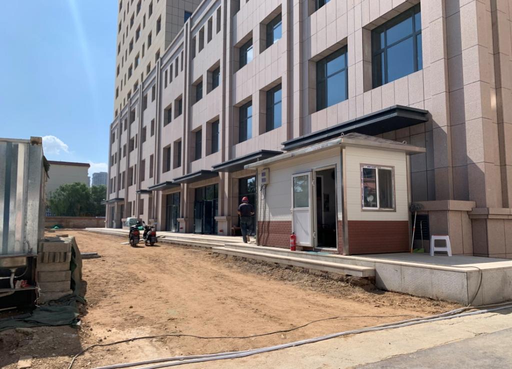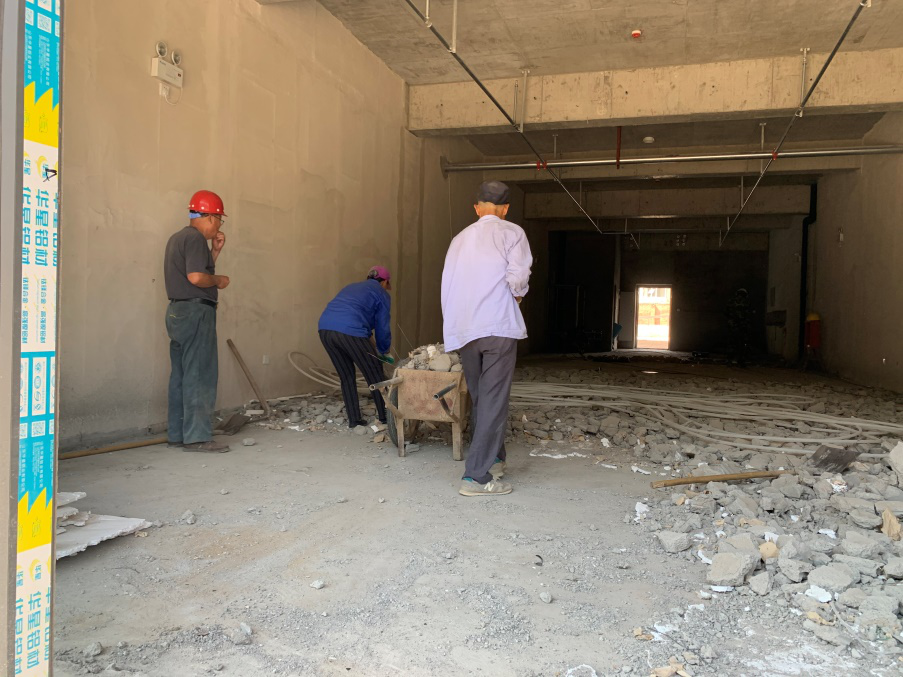 丰州大厦是本次调查的之江房地产公司所承包的两个项目之一。目前该项目已接近竣工阶段,正在对周围地面进行硬化。布满挖掘机轮痕的黄土地上停着一辆三轮货车和两辆电动车,应该是工人们的。一旁的毛坯房内也有三名头戴安全帽的工人,正用小推车运送着施工留下的瓦砾。另一隔间中有几张简单的地铺,旁边还堆放着工人们的饭盒、脸盆等生活用品,整个工地可谓热火朝天中透着井然有序。