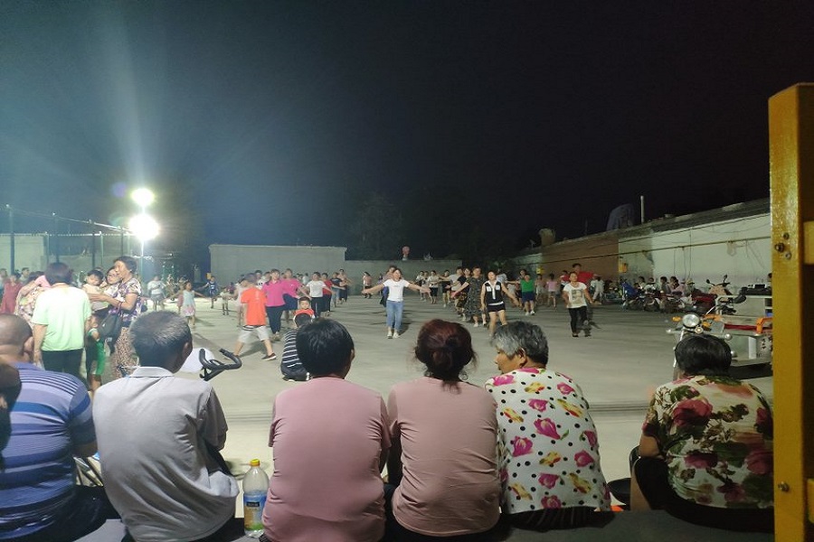 晚上7点左右,团队来到了中心广场进行参与观察并开展访谈。在晚上七点半左右,中心广场上已响起了欢快有力的音乐,一些村民听见音乐之后,三三两两地朝着广场走去,不到8点,广场上已聚起了数排随着音乐跳舞的妇女。而在广场旁边的台阶上也围坐者一圈上了岁数的老人,他们和相熟的人坐在一堆,相互谈笑着。在广场边缘,许多小孩在追逐打闹;在球场上,每一个年龄段的人都有,他们围在篮筐下,玩着投球的游戏。整个广场上显得十分热闹。