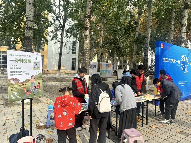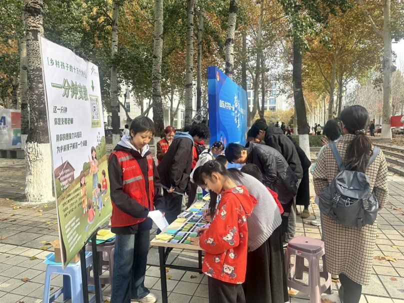 青年志愿者协会美丽中国项目组于2024年11月16日至17日,在山大中心校区齐园南侧举办了“一分钟支教”线下展台活动。此次活动旨在搭建大学生与乡村儿童之间的桥梁,传递知识与关爱。