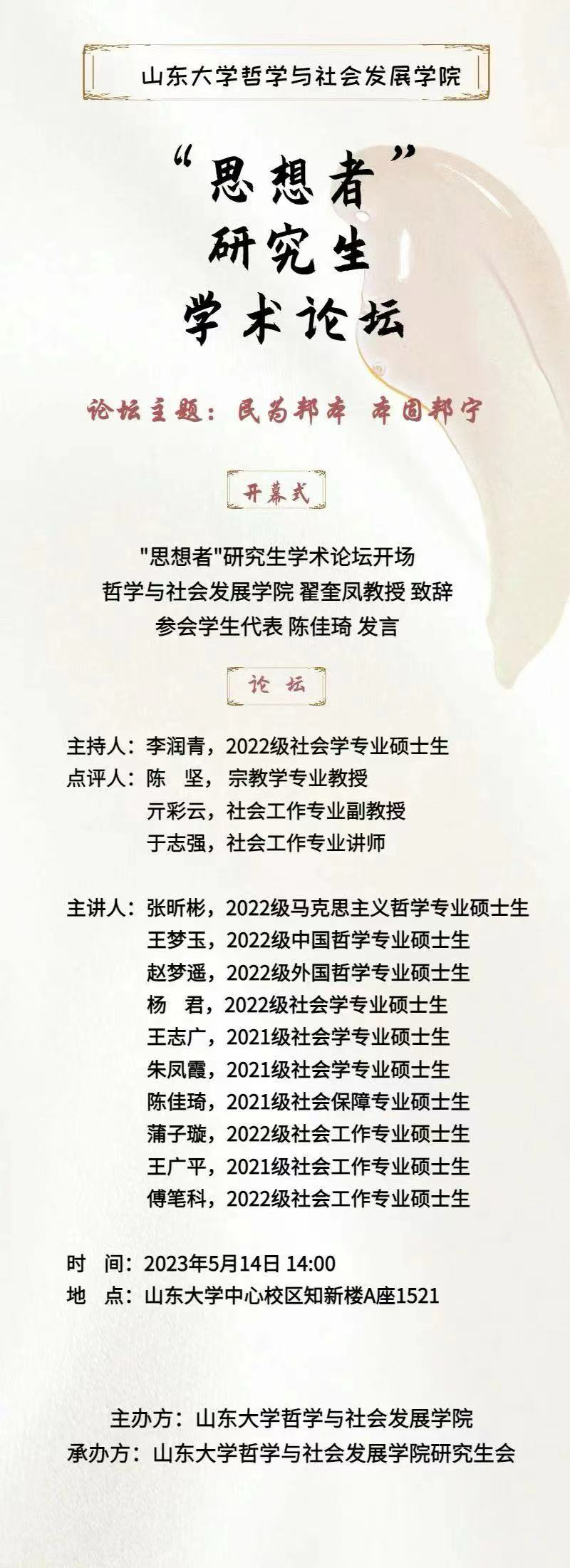 为传承山大文化血脉、发展特色哲社文化精心打造的文化品牌,成功入选学校“一院一品”文化建设项目。致力于通过阅典之知—— “吟典”经典文化诵读活动;启智之行—— “览岳”哲学本科生论坛;知行之路——社会学专业系列实地调研活动;嘤鸣之旅—— “融创哲社”创新创业系列品牌;学思之维——做实做强“思想者”等系列品牌,打造多层次、宽领域的立体化宣传矩阵,并结合哲社学院兼具思辨性与实践性的学科特色,塑造传播正能量,涵养山大基因,致力于为学校加快构建具有中国特色、中国风格、中国气派的哲学社会科学贡献哲社智慧,为丰富山大文化内涵、熔铸新时代山大精神做出现实贡献。