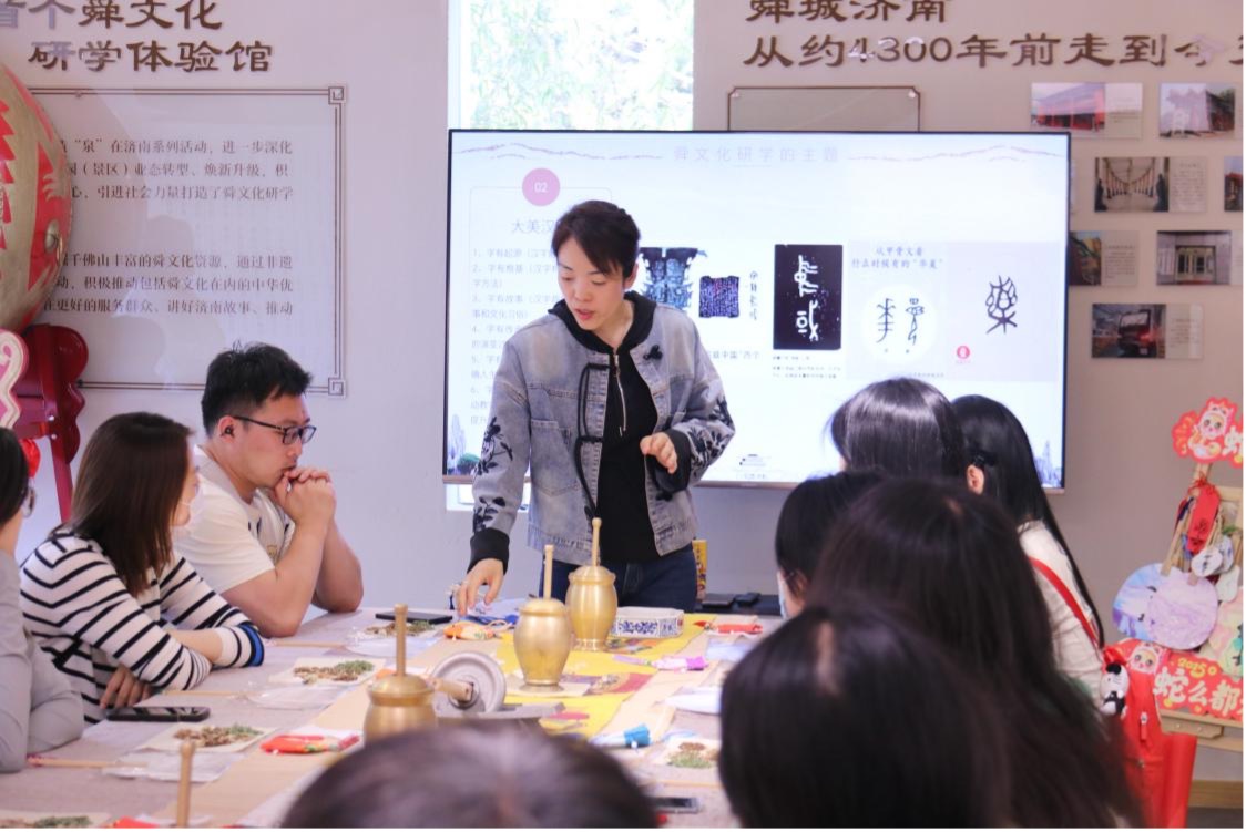 师生前往济南舜文化体验基地开展研学活动。舜城文昌书院院长张雨桐带领师生实地探访“尧帝访贤”“历山溯源”“舜耕历山”等文化景观,通过文物讲解与场景还原,系统阐释舜文化中“德、孝、仁、和”的价值内涵。孙志轩同学表示:“老师解读‘德’字的‘行正守心’之意,让我深刻认识到先贤思想对中华文明传承的深远影响。”尹洁认为“当代社会主义核心价值观中‘和谐’‘友善’等内容与舜帝治理思想一脉相承,这种跨越时空的精神共鸣令人深受启发。”