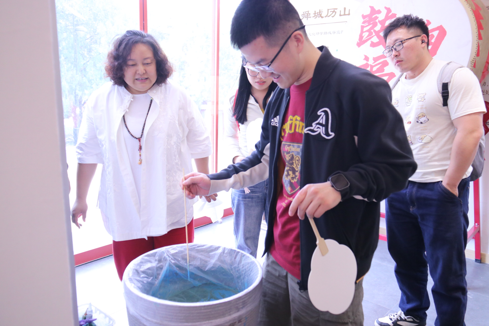 研究生联合培养基地导师、舜文化体验馆馆长陶丽丽及非遗传承人的指导下,共同开展中药香囊、漆扇及书法创作活动。通过亲身体验传统技艺,师生在实践中共悟文化精髓,深化导学互动。耿倩在漆扇创作中感悟到流动的东方色彩不是标本,而是新时代青年续写的新年轮;钟林杉在与老师一同制作香囊时感慨道:“一针一线的‘笨功夫’,恰是治愈现代浮躁的良方。”贾祥瑜认为此次非遗制作是“掌心对时光的温柔叙事”,其中不仅蕴含了传统技艺的传承,更感受到了师生之间的情感联结。