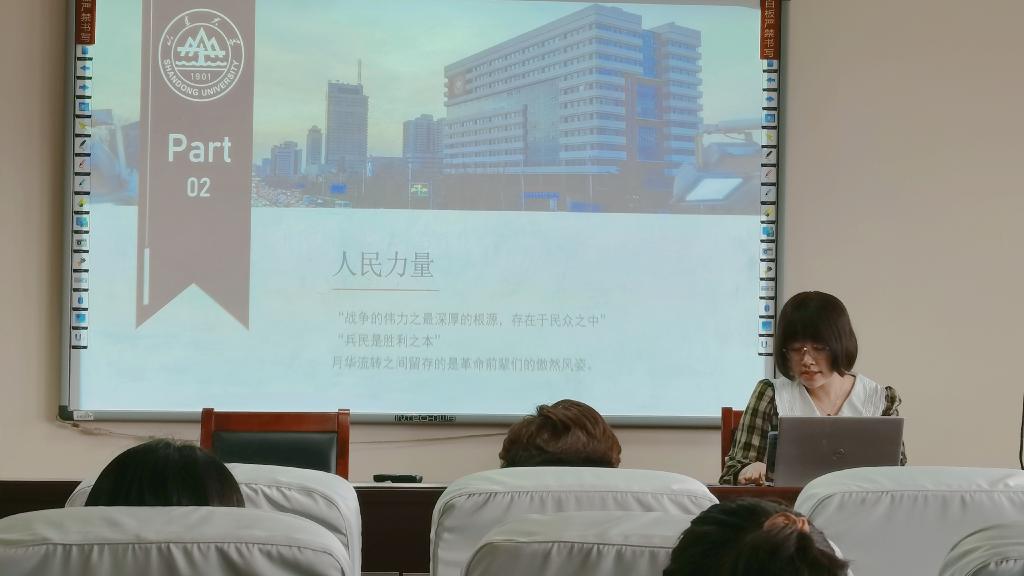 周海鸥、张煜以“抗日战争是党领导下的人民战争为题”,从中国军队、人民力量、民族凝聚力、党的引领四方面出发,介绍抗日战争时期的具体史实以及抗日战争胜利的具体原因。中华民族有着像长城一般保卫国家的中国军队,有着千千万万个像“邓玉芬”这样的平民百姓投身抗日洪流。正如习近平总书记指出:“在这场救亡图存的伟大斗争中,中华儿女为中华民族独立和自由不惜拋头颅、洒热血,母亲送儿打日寇,妻子送郎上战场,男女老少齐动员。”究其根源,这离不开民族凝聚力的形成,离不开党的引领。中华民族到了最危险的时候,不同阶层、不同职业、不同民族、不同宗教信仰的人民群众,团结一心,一致抗日。共产党审时度势,提出并实行符合实际的政策,推进抗日进程。