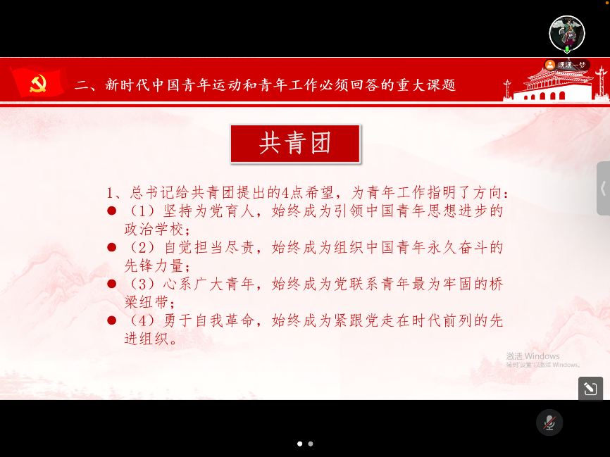 随后,鉴伟伟同志带领支部成员共同学习习近平总书记在庆祝中国共青团成立100周年大会上的讲话,着重学习“在新的征程上,如何更好把青年团结起来、组织起来、动员起来,为实现第二个百年奋斗目标、实现中华民族伟大复兴的中国梦而奋斗”这一重大课题。习近平总书记指出,新时代的中国青年,更加自信自强、富于思辨精神,同时也面临各种社会思潮的现实影响,难免会在理想和现实、主义和问题、利己和利他、小我和大我、民族和世界等方面遇到思想困惑。在这样的背景下,习近平总书记给共青团提出的四点希望,为青年工作指明了方向:第一,坚持为党育人,始终成为引领中国青年思想进步的政治学校;第二,自觉担当尽责,始终成为组织中国青年永久奋斗的先锋力量;第三,心系广大青年,始终成为党联系青年最为牢固的桥梁纽带;第四,勇于自我革命,始终成为紧跟党走在时代前列的先进组织。